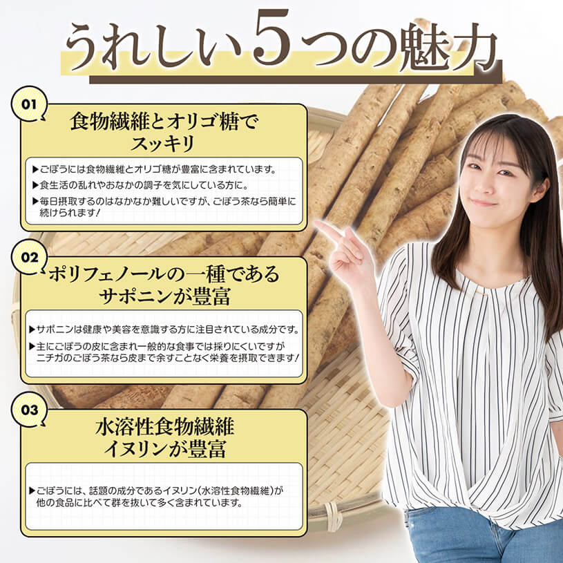 ごぼうは、ノンカフェインで、体にやさしく、イヌリンやサポニン、食物繊維が含まれているため、美容と健康をサポートします。
